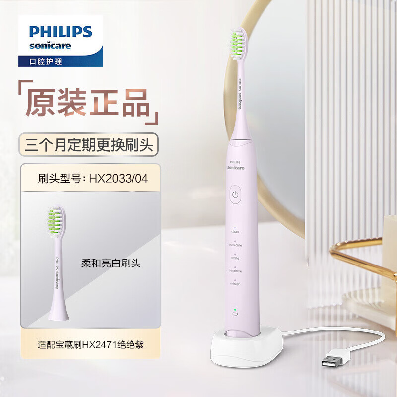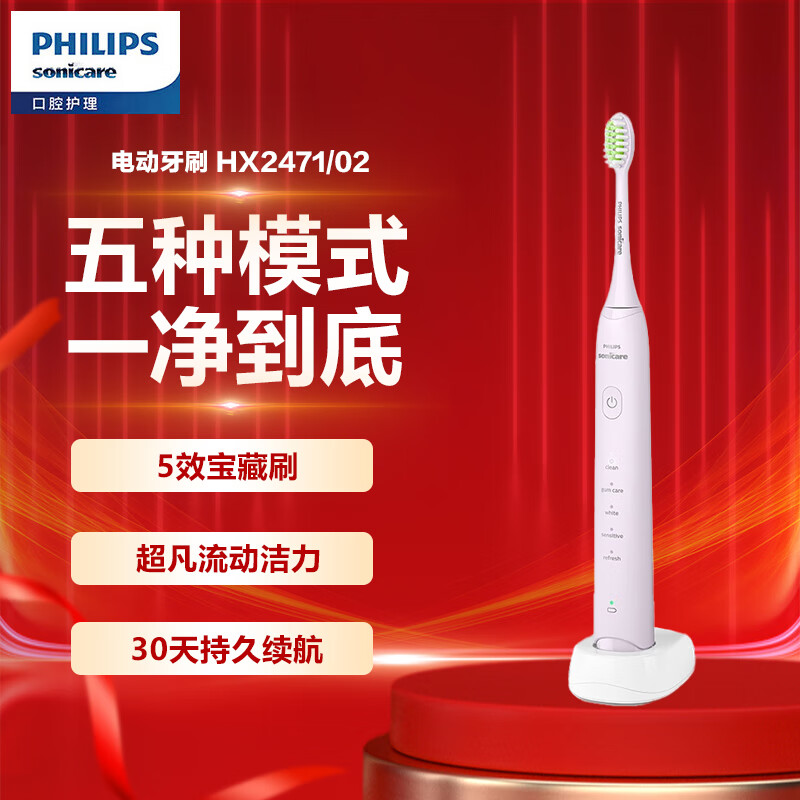 飞利浦(PHILIPS)电动牙刷成人情侣款 送女友/男友 软毛柔和亮白刷头5效宝藏刷 绝绝紫HX2471/02价格:259.00元!