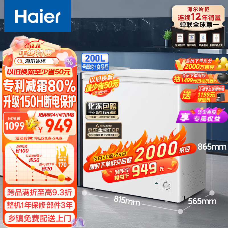 海尔(Haier)200升低霜小冰柜家用商用冷藏柜冷冻柜两用冰柜小型租房用小冰箱小型冷柜BC/BD-200GHDT以旧换新价格:999.00元!