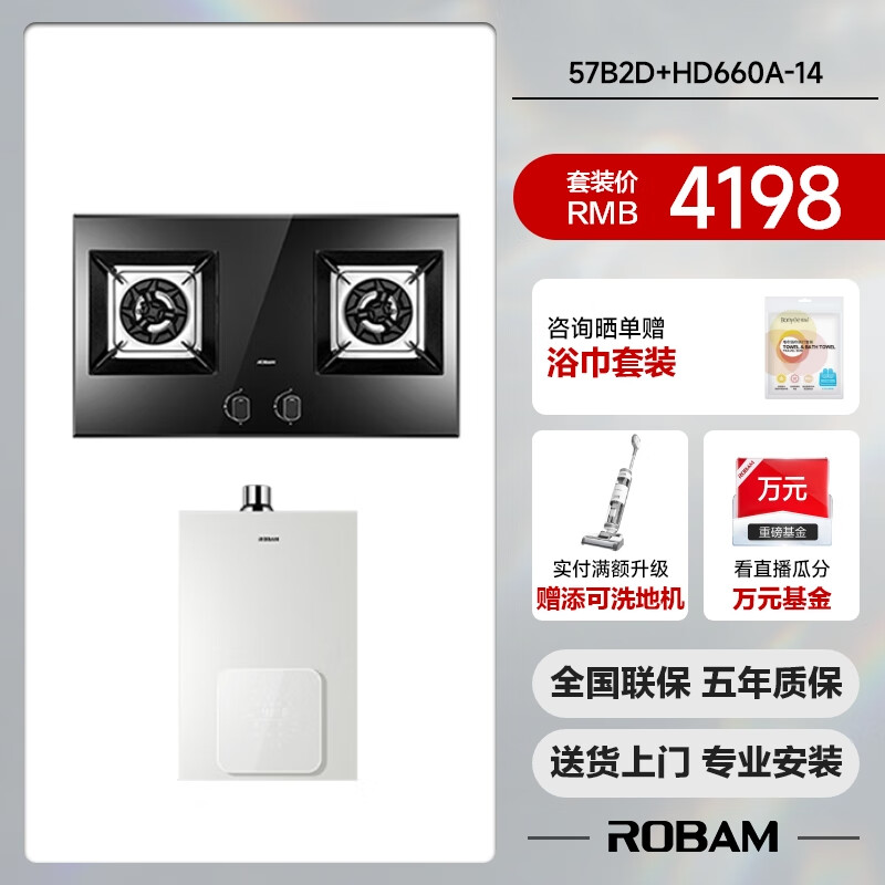 老板(Robam)家用嵌入式5.0+kW大火力燃气灶 钢化玻璃 14+1L变频恒温燃气热水器天然气套装57B2DT+HD660A-14价格:4198.00元!