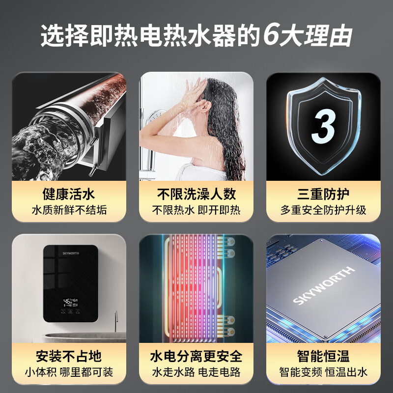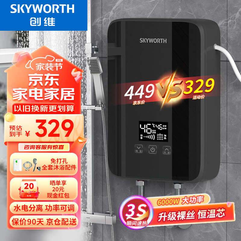 创维(Skyworth)即热式电热水器 【免打孔安装】速热式家用节能变频恒温过水热洗澡机多功率可调D873星耀黑6000W价格:329.00元!