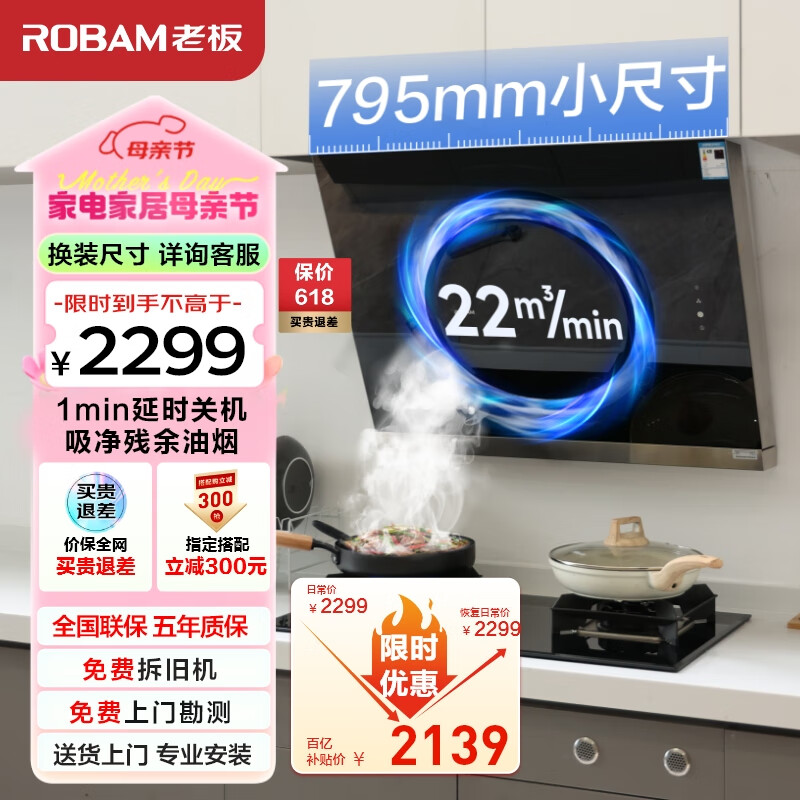 老板(Robam)抽油烟机老板油烟机小户型侧吸式油烟机家用22m3大风量吸油烟机免拆洗易清洁烟机26A5SH价格:2139.00元!