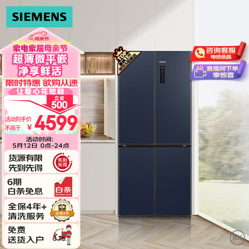 西门子(SIEMENS)十字星系列497升超薄微平嵌冰箱双开门四开门十字四门嵌入式近60cm净味变温储鲜湖蕴蓝KC505681EC价格:5099.00元!