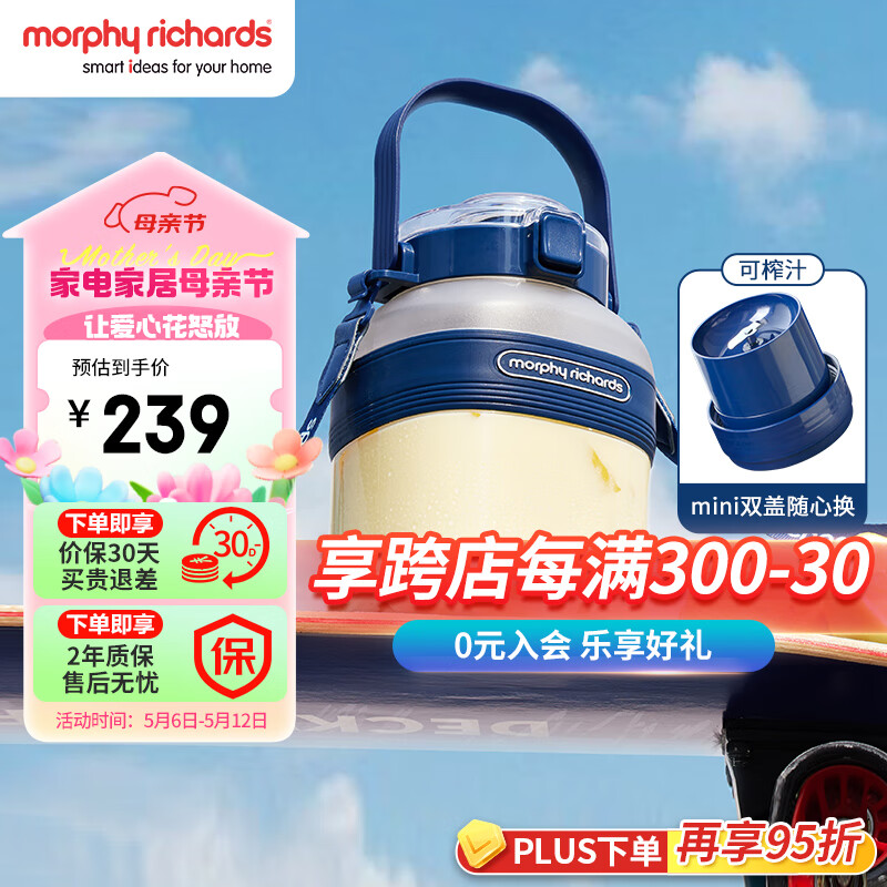 摩飞电器(Morphyrichards)榨汁机 榨汁桶便携榨汁杯无线充电果汁杯随行杯1升容量户外果茶冷泡桶迷你小胖吨MR9805 Nano版 蓝价格:239.00元!