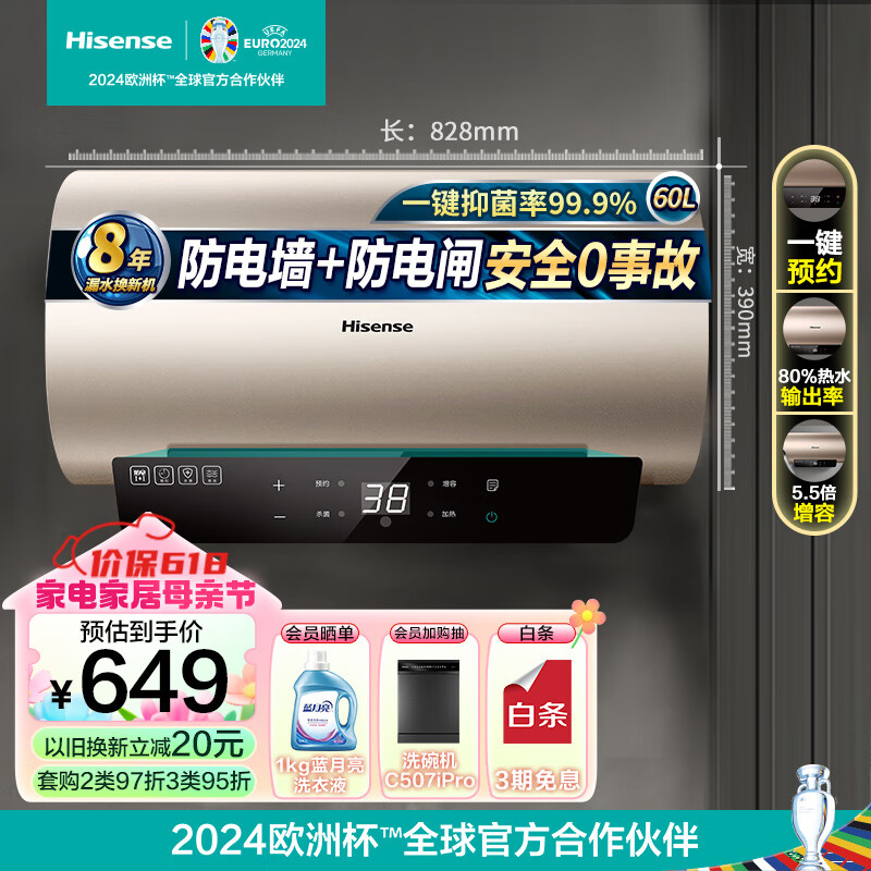 海信(Hisense)60升电热水器家用速热5.5倍增容健康灭菌大屏触控节能省电多重保障DC60-W1513T以旧换新价格:649.00元!