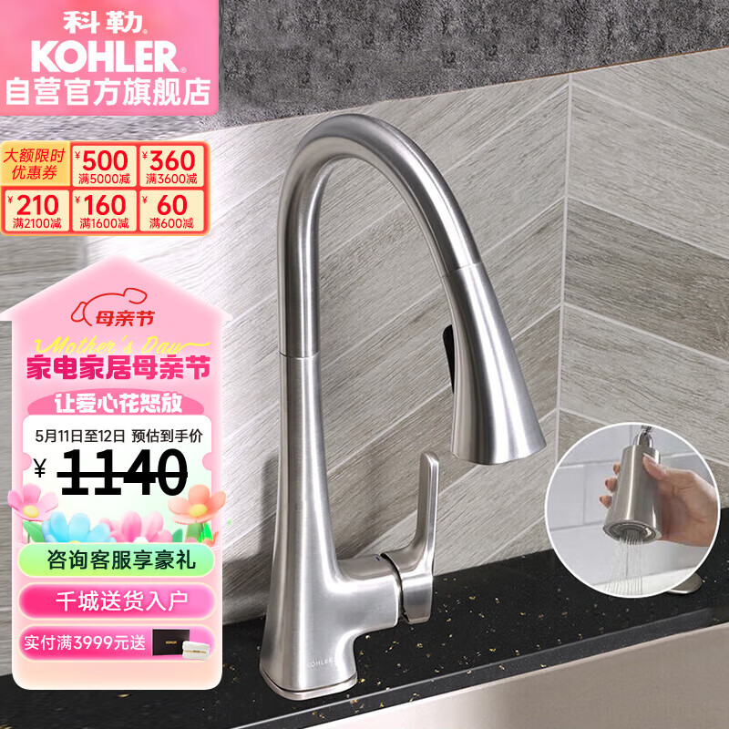 科勒(KOHLER)厨房水槽龙头抽拉式冷热水洗菜盆龙头旋转式龙头22867T 抽拉龙头价格:1411.00元!