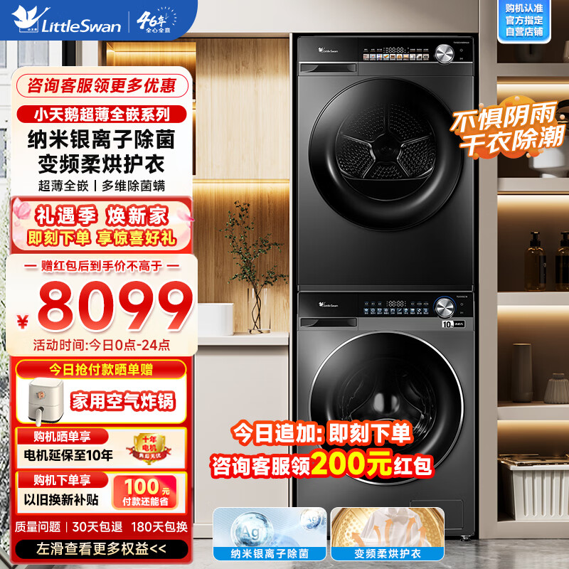 小天鹅洗烘套装10KG滚筒洗衣机+变频热泵烘干机 超薄全嵌【小乌梅MAX轻享版】TG100SC18+TH100VH81MAX价格:8099.00元!