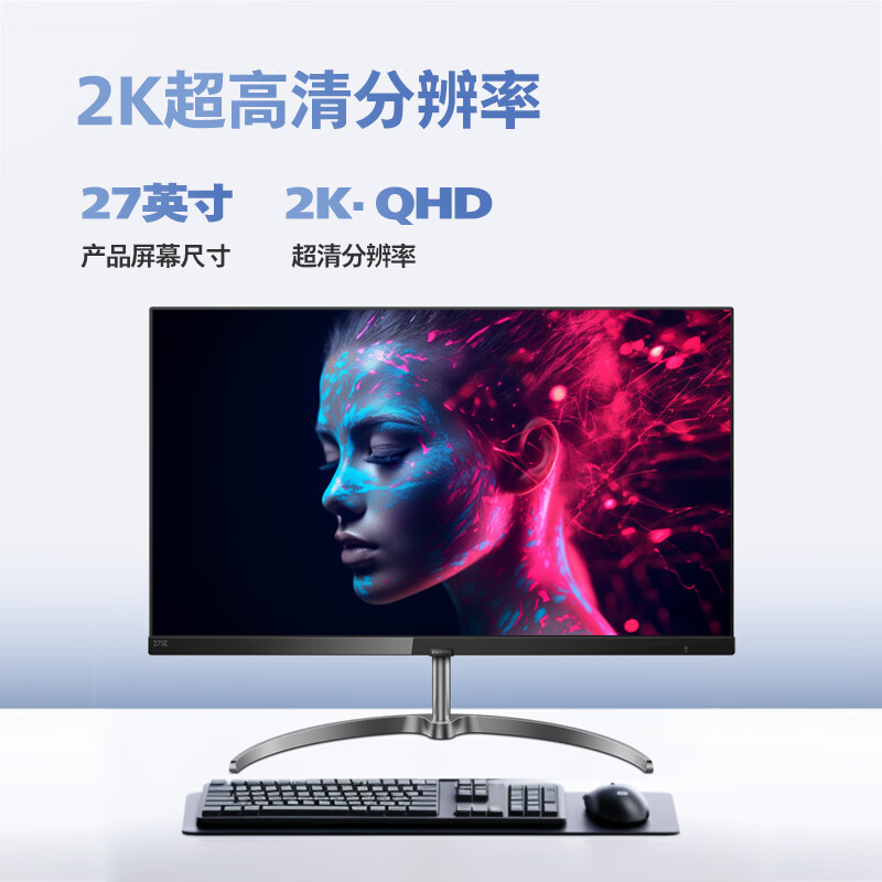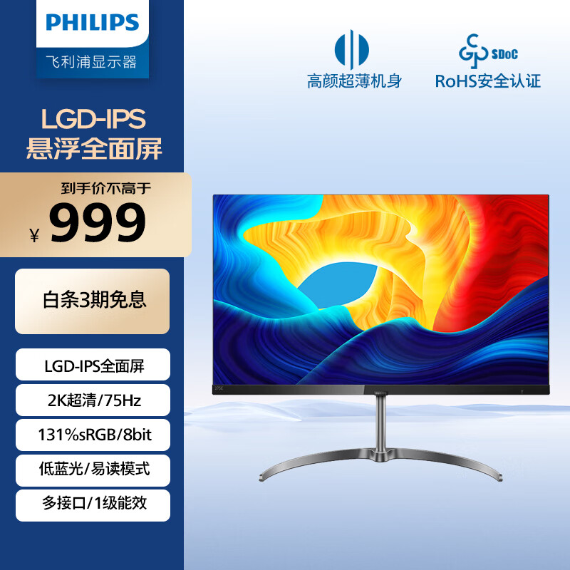 飞利浦 27英寸 LGD-IPS悬浮屏 2K超薄75Hz 131%sRGB广色域金属支架底座高清设计娱乐办公显示器275E9价格:999.00元!