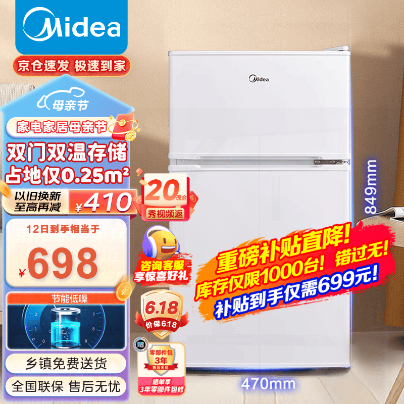 美的(Midea)90升迷你双开门小冰箱租房宿舍办公室小型家用双温可冷冻冷藏节能环保省电低耗低音 BCD-90CM价格:698.00元!