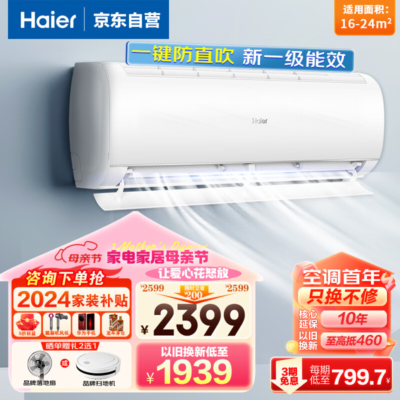 海尔(Haier)新一级能效1.5匹变频空调 光感APP智控快速冷暖自清洁大风量卧室壁挂式空调防直吹以旧换新35KPB81价格:2499.00元!