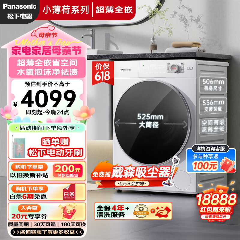 松下(Panasonic)滚筒洗衣机全自动 506超薄全嵌【小薄荷S】10公斤户外服洗1.1洗净比 水氧泡沫净 除菌XQG100-M1F5价格:4099.00元!