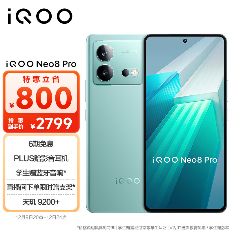 vivo iQOO Neo8 Pro 16GB+512GB 冲浪 天玑9200+ 自研芯片V1+ 120W超快闪充 144Hz高刷 5G游戏电竞性能手机价格:3599.00元!