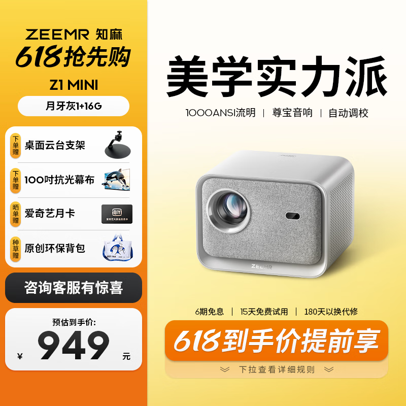 知麻New Z1 mini 投影仪家用 投影机卧室客厅 智能家庭影院芝麻(1000ANSI流明 全自动校正 全域清晰)价格:949.00元!