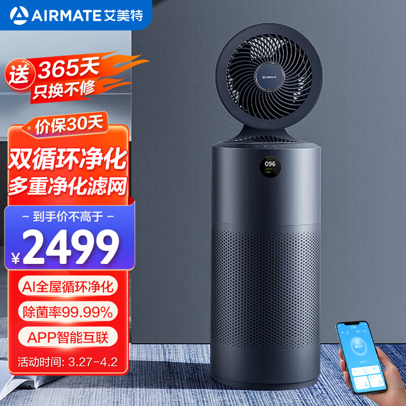 艾美特(AIRMATE)负离子净化空气循环扇智能全屋家用空气净化器直流变频低噪轻音落地扇四季适用电风扇 AIR7 PRO价格:2999.00元!