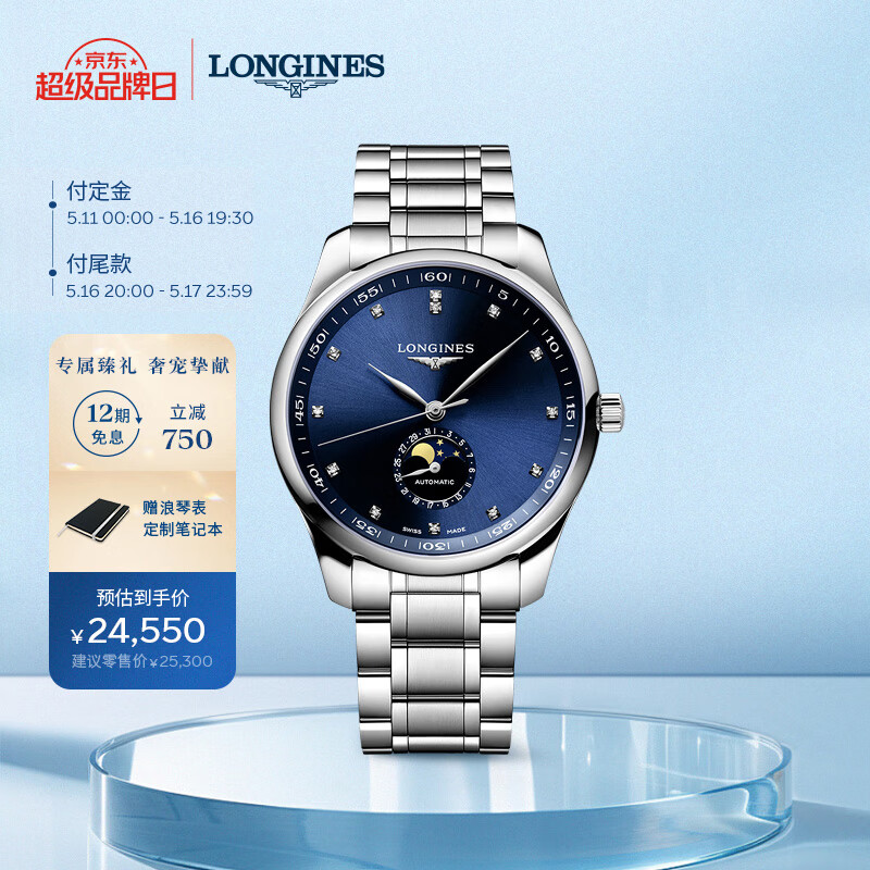 浪琴(LONGINES)瑞士手表 名匠系列 月相机械钢带男表 L29194976价格:24550.00元!