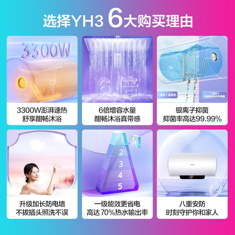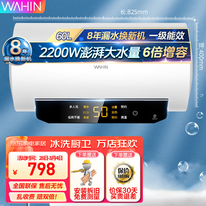 美的出品储水式热水器电热水器50/60升速热一级能效节能带预约功能六倍增容速热防漏电防电墙 60L 华凌YH3-白色-2200w价格:798.00元!