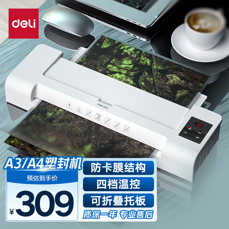 得力家用办公a3/a4照片塑封机过塑机可用a3及以下塑封膜商用相片过胶压膜机封膜机覆膜机防卡膜 14318价格:309.00元!
