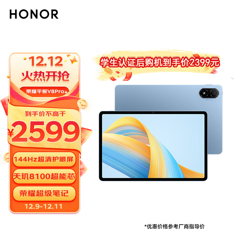 荣耀平板V8 Pro 12.1英寸 8+256GB WiFi版 晴空蓝 144Hz高刷屏 多屏协同 办公影音娱乐学习平板电脑Pad价格:2599.00元!