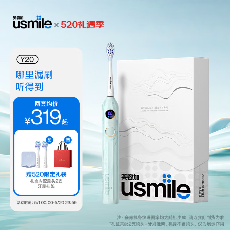 usmile 笑容加电动牙刷 成人声波震动电动牙刷 情侣款送男友/送女友 Y20瓷青 520情人节礼物价格:359.00元!