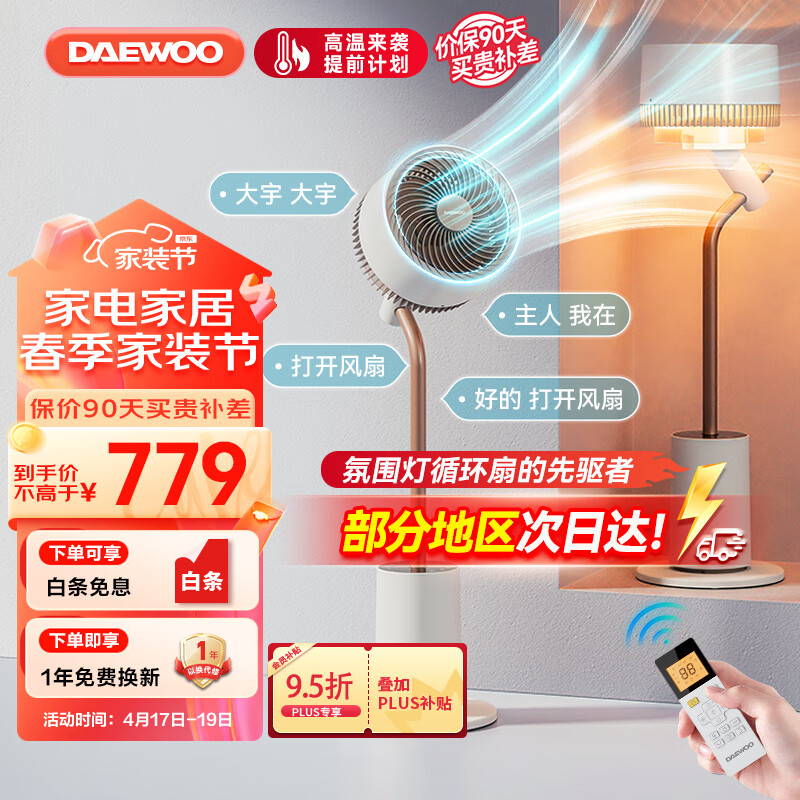 大宇(DAEWOO)【智能语音播报】落地氛围灯杀菌空气循环扇12档立式电风扇轻柔音直流变频小型空调扇F30MAX价格:839.00元!