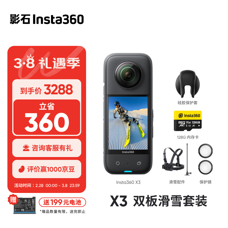 Insta360影石 X3全景运动相机防抖防水摄像机5.7K高清Vlog摩托车骑行滑雪潜水路亚(双板滑雪套装)价格:3288.00元!