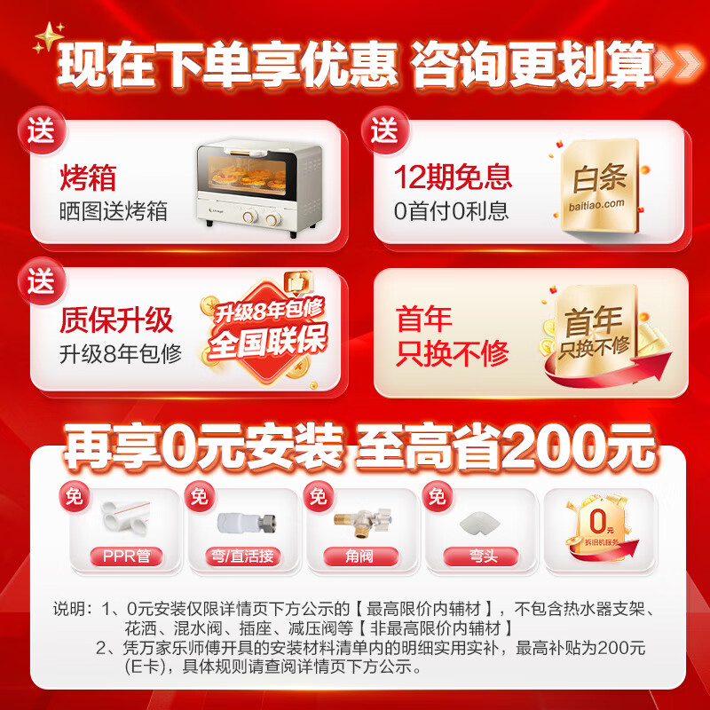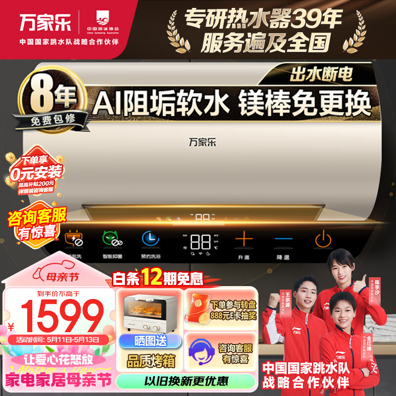 万家乐60升电热水器3200W速热 FOF阻垢净浴 智能杀菌 镁棒免换 出水断电 一级能效D60-FW7价格:1799.00元!