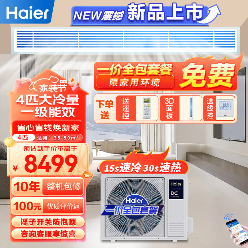 海尔(Haier)中央空调风管机一拖一嵌入式空调4p云璟Plus全直流变频KFRd-90NW/76EG81U1 标配控制器套餐+3D面板价格:8499.00元!