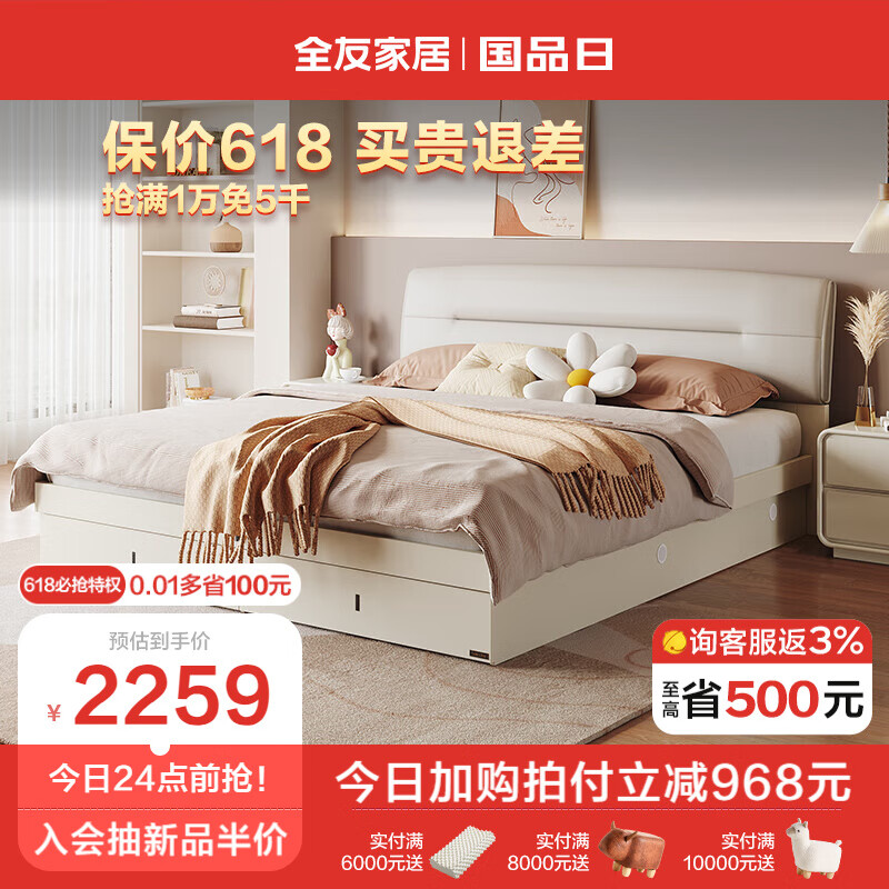 全友家居 床肤感科技布高箱储物床双人床1.8x2米卧室软靠大床DG10001价格:3227.14元!