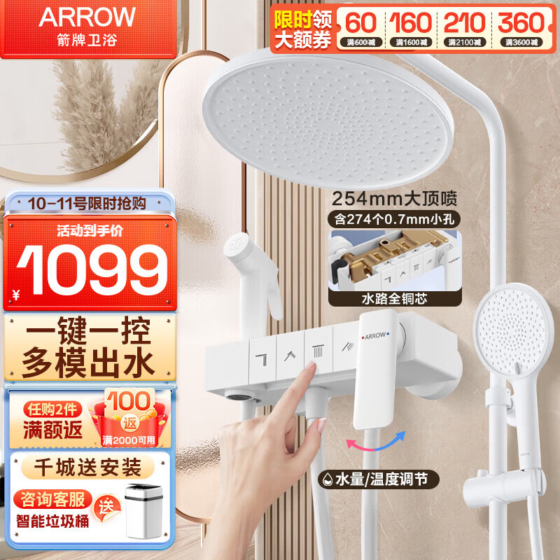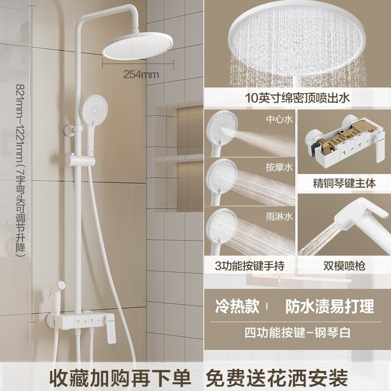 箭牌(ARROW) 淋浴花洒套装增压花洒全套莲蓬头淋雨器套装浴室花洒按键花洒 【钢琴白】按键丨冷热款价格:1299.00元!