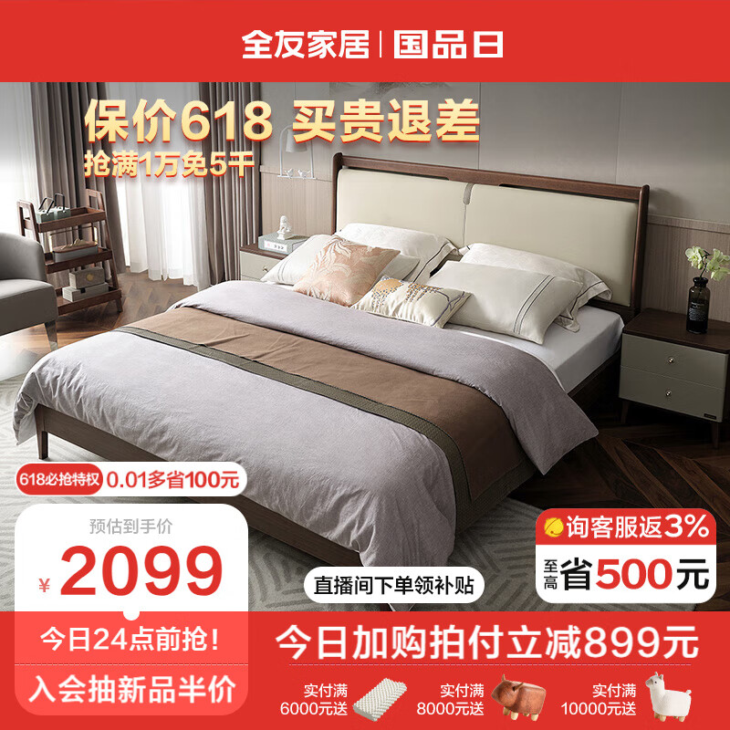 全友家居 新中式床实木脚双人大床主卧室1.5x2米现代轻奢软包床129701价格:2998.57元!