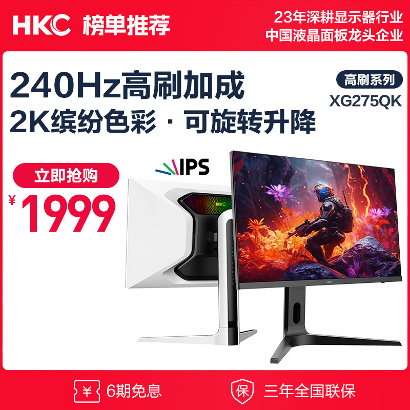 HKC 27英寸 FastIPS 2K 240Hz HDR400 1ms响应 广色域窄边框旋转升降电竞游戏网吧家用显示器 XG275QK价格:2299.00元!