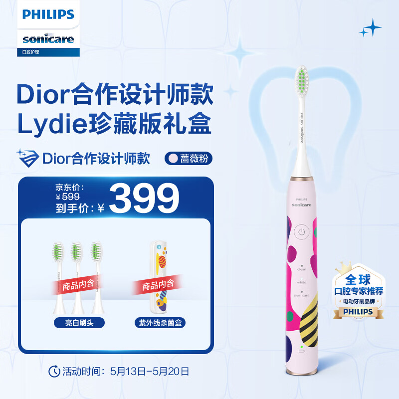 飞利浦(PHILIPS)电动牙刷 520情侣送男/女友 母亲节礼物 S5系列带3支刷头+杀菌牙刷盒设计师款蔷薇粉价格:449.00元!