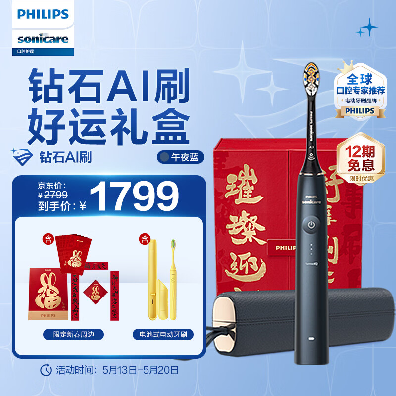 飞利浦(PHILIPS)电动牙刷 520情侣送男/女友 母亲节礼物 含皮质充电盒 20倍清除牙菌斑 钻石AI刷礼盒款 午夜蓝价格:1999.00元!