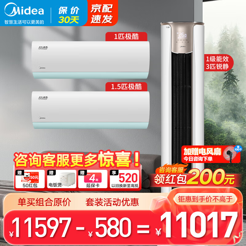 美的空调套装 新一级能效两室一厅套餐全直流变频冷暖 大出风口APP智控 极酷(1匹+1.5匹)+锐静3匹价格:11017.00元!