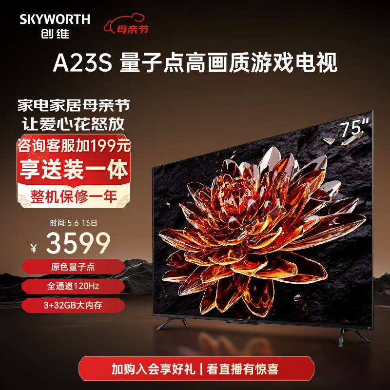 创维电视75A23S 75英寸电视机量子点120Hz高刷3+32G蓝牙5.0双频WIFI 4K超高清声控屏游戏电视价格:3499.00元!