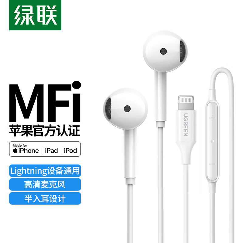 绿联 苹果耳机半入耳式有线MFi认证 Lightning接口线控带麦适用iPhone14/13/12/11XrProMax价格:108.90元!
