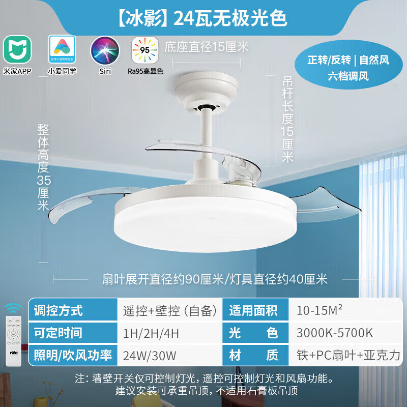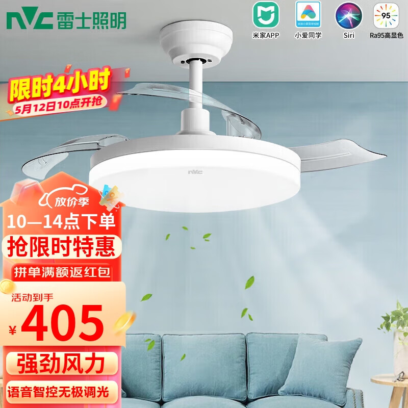雷士(NVC)吊扇灯隐形风扇灯极简餐厅卧室语音米家智控无极调光调色变频36寸价格:450.00元!