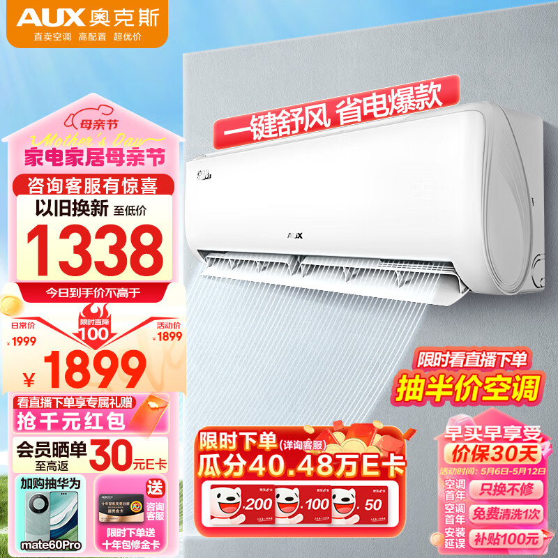 奥克斯(AUX)大1匹 新1级能效 易拆银离子滤网 变频冷暖 京裕Ⅱ空调挂机(KFR-26GW/BpR3AQE1(B1)) 独立除湿价格:1799.00元!