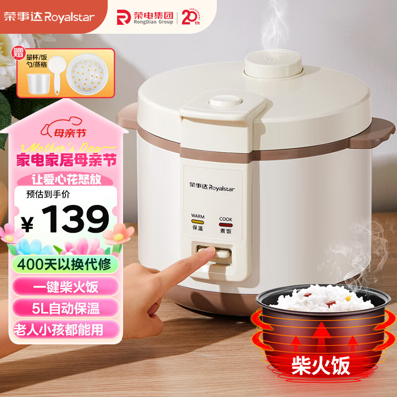 荣事达(Royalstar)电饭煲家用5L不沾内胆微压焖香柴火饭小型迷你多功能一键机械式带蒸笼电饭锅 RX-50V1价格:139.00元!
