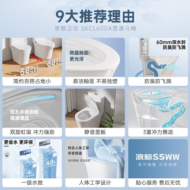 浪鲸(SSWW) 马桶大冲力喷射虹吸式大口径坐便器静音缓降盖板防臭座便马桶 双重旋冲超静音小座鲸-400坑距价格:1099.00元!
