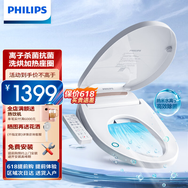 飞利浦(PHILIPS)智能马桶盖离子除菌即热恒温洗烘两用 抗菌自洁智能坐便盖AIB1822价格:1399.00元!