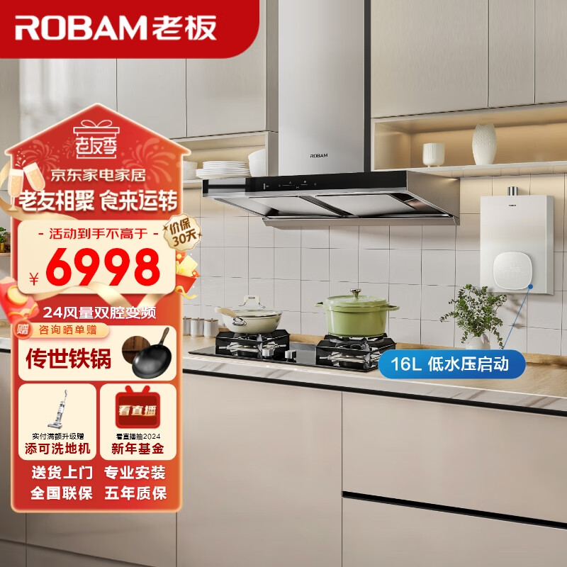 老板(Robam)烟灶热厨房多件套24风量欧式双腔变频大吸力吸油烟机灶具16升燃气热水器60D3S+57B2DT+HT322A-16价格:6998.00元!