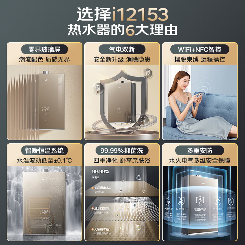 华帝(VATTI)16升 即热式恒温燃气热水器天然气 气电双断保护 WiFi智控恒温 ECO节能变升 水伺服级恒温 16L 摩卡金 i12153-16价格:1499.00元!