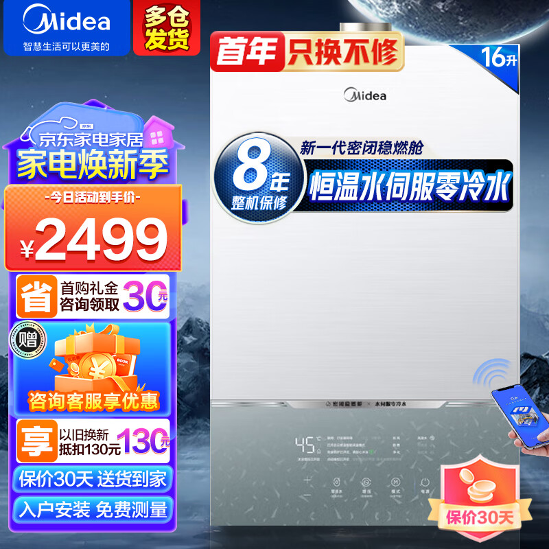 美的(Midea)16升燃气热水器下置风机天然气 双增压零冷水 水伺服恒温新一代密闭稳燃舱高楼层JSQ30-MATE Ultra价格:2499.00元!