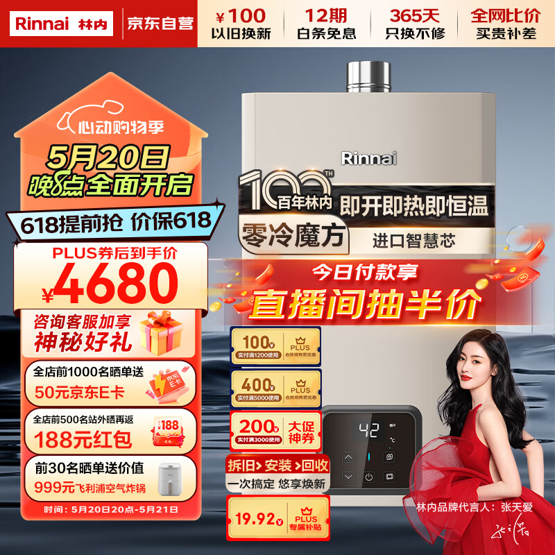 林内(Rinnai)【零冷魔方】16升燃气热水器 零冷水即开即热即恒温 家用天然气 RUS-16GD61R(JSQ31-GD61R)价格:4980.00元!