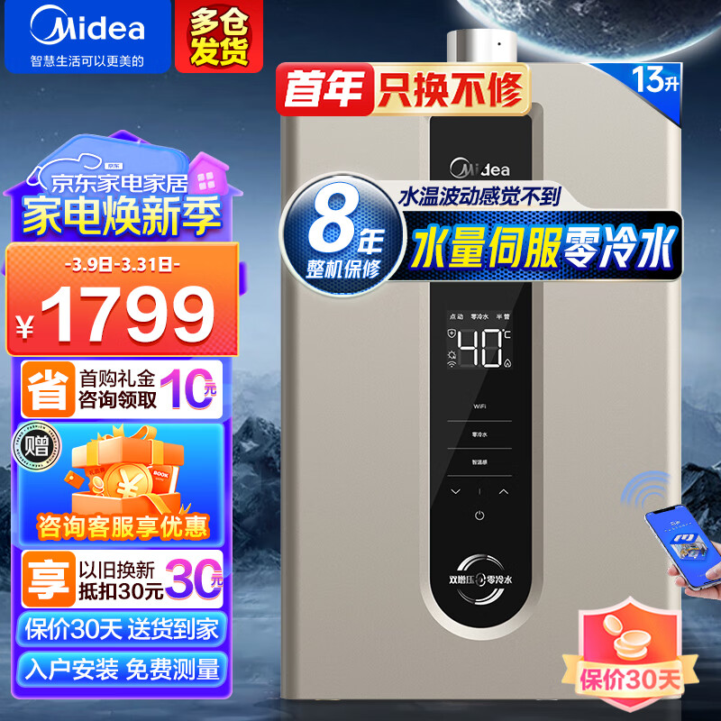 美的(Midea)13升燃气热水器家用天然气零冷水双增压水伺服变频恒温节能 智能开机自检即开即热JSQ25-RD3pro价格:1699.00元!