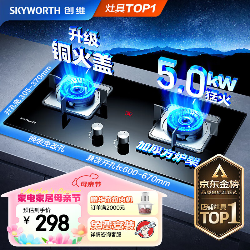 创维(Skyworth)燃气灶双灶家用煤气灶液化气猛火灶 5.0kW大火力灶具台式嵌入式 钢化玻璃灶台免改孔Z50BS-1/液价格:287.00元!