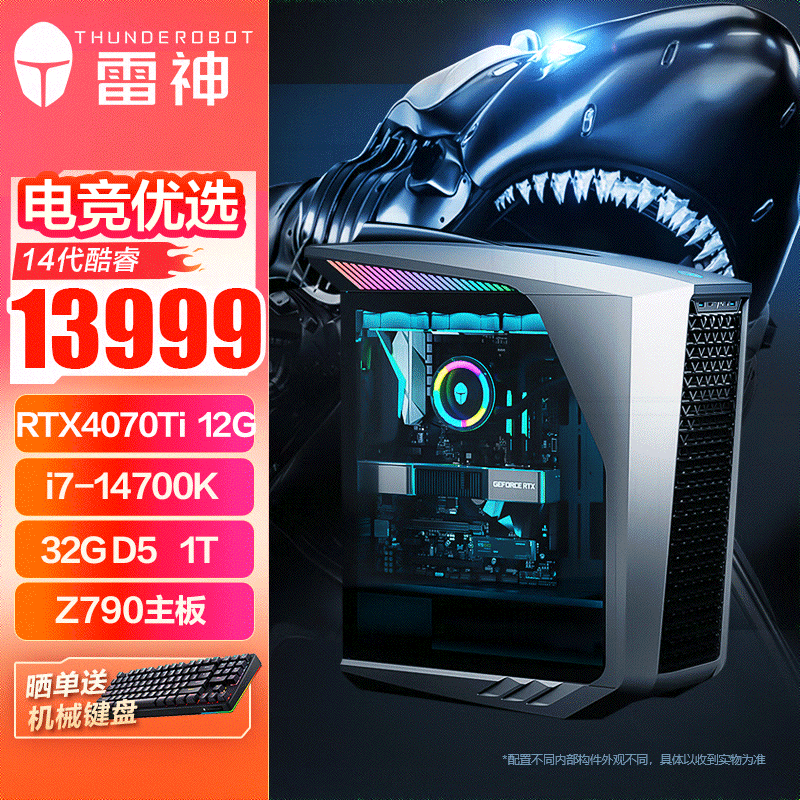雷神(ThundeRobot)黑武士·Shark 游戏设计台式电脑电竞主机(14代i7-14700K 32G DDR5 RTX4070Ti 1TSSD 360水冷)价格:13999.00元!