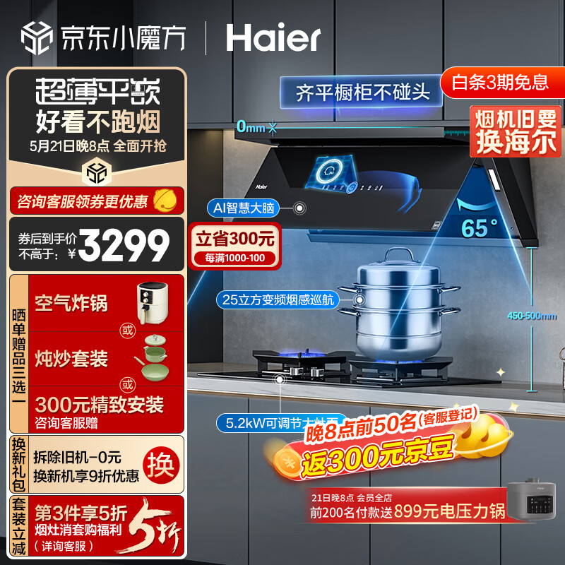 海尔(Haier)抽油烟机 超薄近吸烟灶套装 25m3/min变频有效风顶侧双吸外观 家用吸油烟机燃气灶具C21U1+Q7BE3天价格:3599.00元!