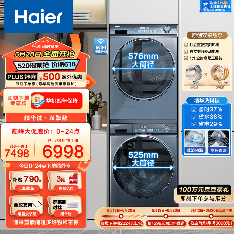 海尔(Haier)SL6精华洗洗烘套装 10KG超薄滚筒洗衣机全自动+双擎热泵烘干机家用 1.1洗净比 SL6+81 以旧换新价格:7498.00元!
