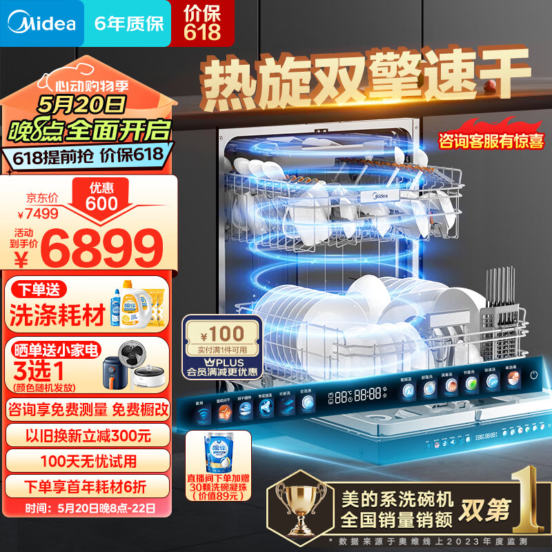 美的(Midea)16套嵌入式洗碗机 GX3000 双擎晶焰速干 105℃热风烘干 五臂飓风洗 双驱变频 四星消毒 一级水效价格:9999.00元!